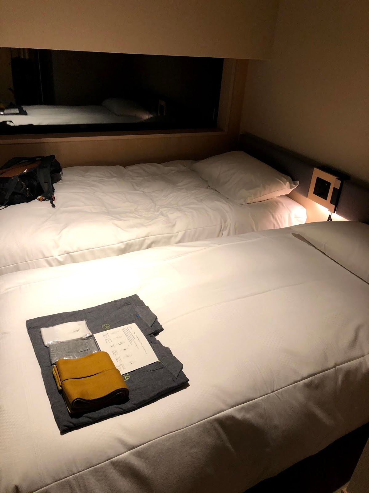 房間不意外的不大,但是床很舒服。除了該有設備外,都有附上浴衣,也有貼心的教學。並且有一個小籃子裝著大小浴巾,讓你帶上頂樓的溫泉浴池。