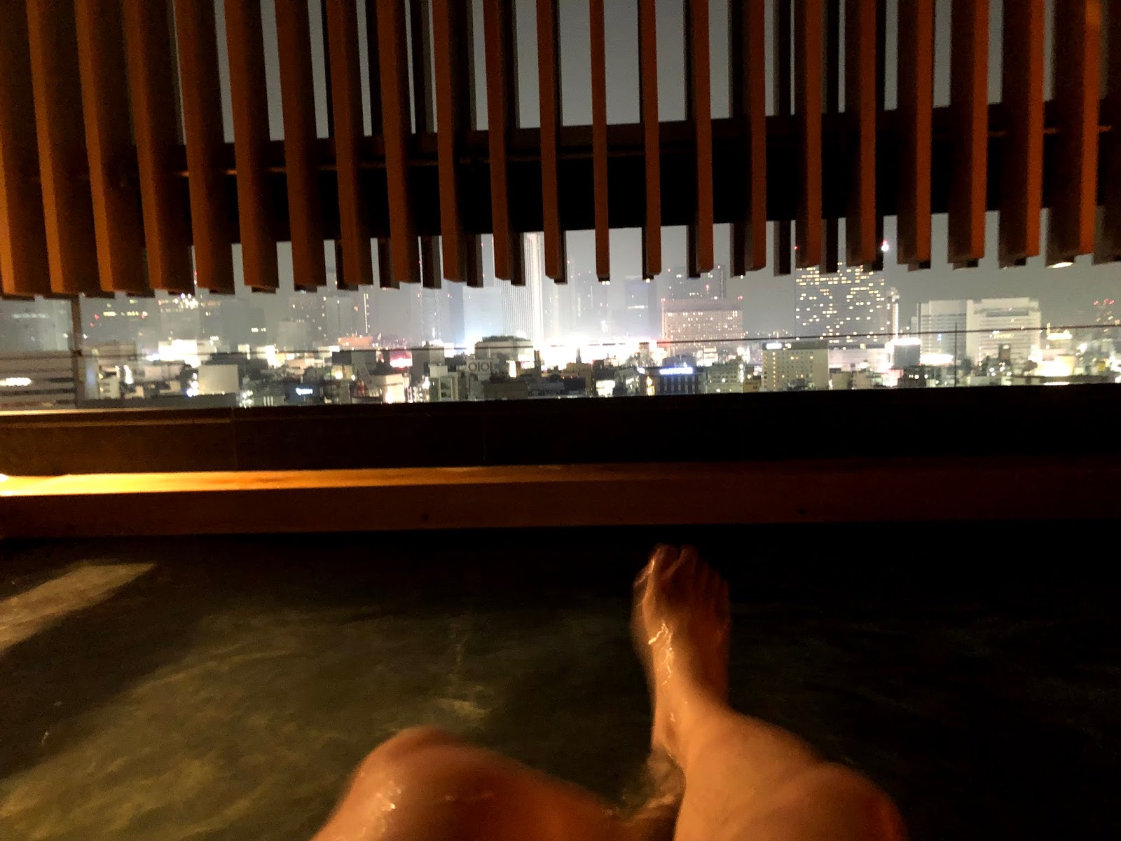 由綠它的澡堂分成室內和室外,室內難免有點起霧,但還是能看到不錯的夜景。18樓在這一區算是很高,附近並沒有更高的大樓遮蔽視線。若是能在這裡打一炮該有多好。